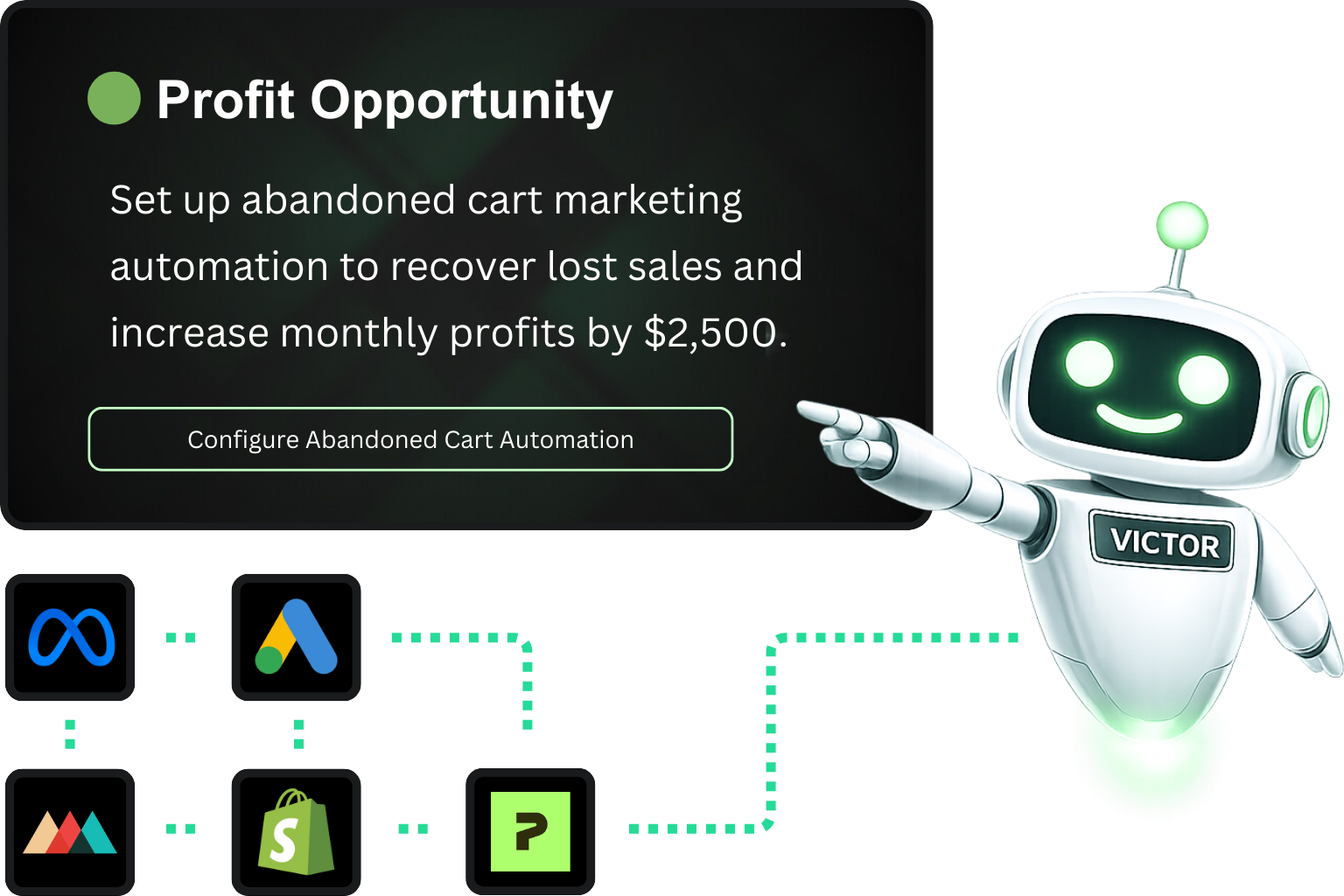Victor works 24/7 monitoring ad costs and POD data to notify you if your margins dip.