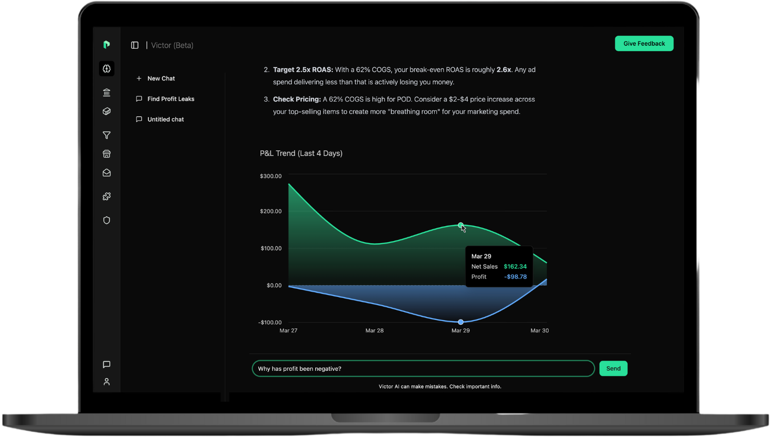 Forget the spreadsheets and calculators. Victor automatically calculates your real profits, explains the driving forces, and tells you exactly what to do next.